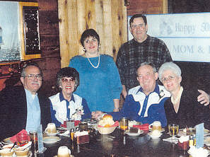 Edwin F., Adeline and Mike Biskup, and Rita Young, Carole (Biskup) and Lynn Hanson (In Back) at Adeline and Mike's 50th Anniversary